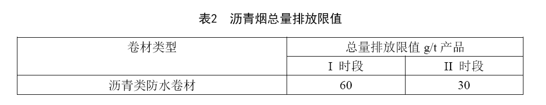 瀝青類防水卷材生產過程中,生產線以單位產品重量核算的瀝青煙排放總量執(zhí)行表2規(guī)定。