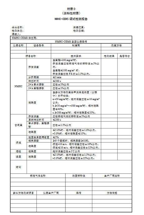 9.3.3驗(yàn)收?qǐng)?bào)告技術(shù)指標(biāo)驗(yàn)收測(cè)試報(bào)告應(yīng)包括以下信息:a)報(bào)告標(biāo)識(shí)-編號(hào);b)檢測(cè)日期和編制報(bào)告日期;c)NMHC-CEMS標(biāo)識(shí)-制造單位、型號(hào)和系列編號(hào);d)包括在系統(tǒng)中的NMHC-CEMS的主要組件(如氣體檢測(cè)器、流速CMS等);e)安裝NMHC-CEMS的企業(yè)名稱和安裝位置相關(guān)污染源名稱;f)環(huán)境條件記錄情況(大氣壓力、環(huán)境溫度、環(huán)境濕度);g)示值誤差、分析周期、系統(tǒng)響應(yīng)時(shí)間、零點(diǎn)漂移和量程漂移驗(yàn)收引用的標(biāo)準(zhǔn)及技術(shù)指標(biāo)要求;h)準(zhǔn)確度驗(yàn)收引用的標(biāo)準(zhǔn)及技術(shù)指標(biāo)要求;i)可溯源到國家標(biāo)準(zhǔn)的標(biāo)準(zhǔn)氣體;j)參比方法所用的主要設(shè)備、儀器等;k)檢測(cè)結(jié)果和結(jié)論;l)測(cè)試單位;m)三級(jí)審核簽字;n)色譜分析儀出廠檢測(cè)原始譜圖復(fù)印件;o)驗(yàn)收測(cè)試結(jié)果和驗(yàn)收測(cè)試報(bào)告,格式參照HJ75附錄F;7p)備注(技術(shù)驗(yàn)收單位認(rèn)為與評(píng)估NMHC-CEMS性能相關(guān)的其他信息)。技術(shù)指標(biāo)驗(yàn)收完成后編制技術(shù)指標(biāo)驗(yàn)收?qǐng)?bào)告,技術(shù)指標(biāo)驗(yàn)收結(jié)果應(yīng)達(dá)到本標(biāo)準(zhǔn)表1的要求。