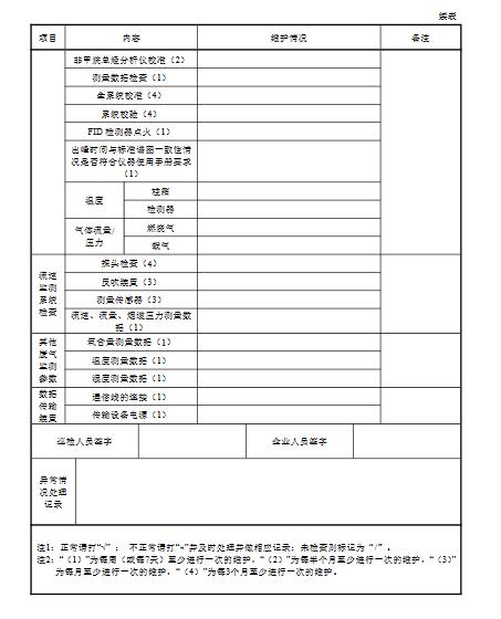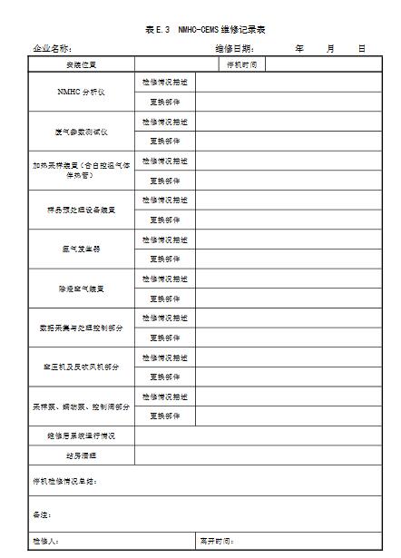 11.3定期維護(hù)維護(hù)頻次按照本標(biāo)準(zhǔn)附表E.1進(jìn)行,定期維護(hù)應(yīng)做到:a)使用氫氣鋼瓶時(shí),至少每周巡檢一次鋼瓶氣的壓力并記錄,有條件的應(yīng)做到一用一備;b)使用氫氣發(fā)生器時(shí),至少每周檢查一次氫氣發(fā)生器變色硅膠的變色 情況,超過2/3變色應(yīng)及時(shí)更換變色硅膠;c)使用氫氣發(fā)生器時(shí),應(yīng)按其說明書規(guī)定,定期檢查氫氣壓力、氫氣發(fā)生器電解液等,根據(jù)使用情況及時(shí)更換,定期添加純凈水;d)至少每周檢查一次除烴裝置溫度是否保持在350°C以上;e)至少每周檢查一次出峰時(shí)間與標(biāo)準(zhǔn)譜圖一致性情況是否符合儀器使用手冊(cè)要求;f)至少每月檢查一次燃燒氣連接管路的氣密性,NMHC-CEMS的過濾器、采樣管路的結(jié)灰情況,若發(fā)現(xiàn)數(shù)據(jù)異常應(yīng)及時(shí)維護(hù);g)至少每半年檢查一次零氣發(fā)生器中的活性炭和NO氧化劑,根據(jù)使用情況進(jìn)行更換;h)使用催化氧化裝置的NMHC-CEMS至少每年用丙烷標(biāo)氣檢驗(yàn)一次轉(zhuǎn)化效率,保證丙烷轉(zhuǎn)化效率在95%以上,否則應(yīng)更換催化氧化裝置;i)更換主要部件如色譜柱、定量環(huán)時(shí)需對(duì)分析儀進(jìn)行多點(diǎn)校準(zhǔn),并記錄校準(zhǔn)數(shù)據(jù)和過程,校準(zhǔn)數(shù)據(jù)符合本標(biāo)準(zhǔn)表1要求且穩(wěn)定后才可投入運(yùn)行;j)定期維護(hù)記錄按本標(biāo)準(zhǔn)附錄E中表格形式記錄。